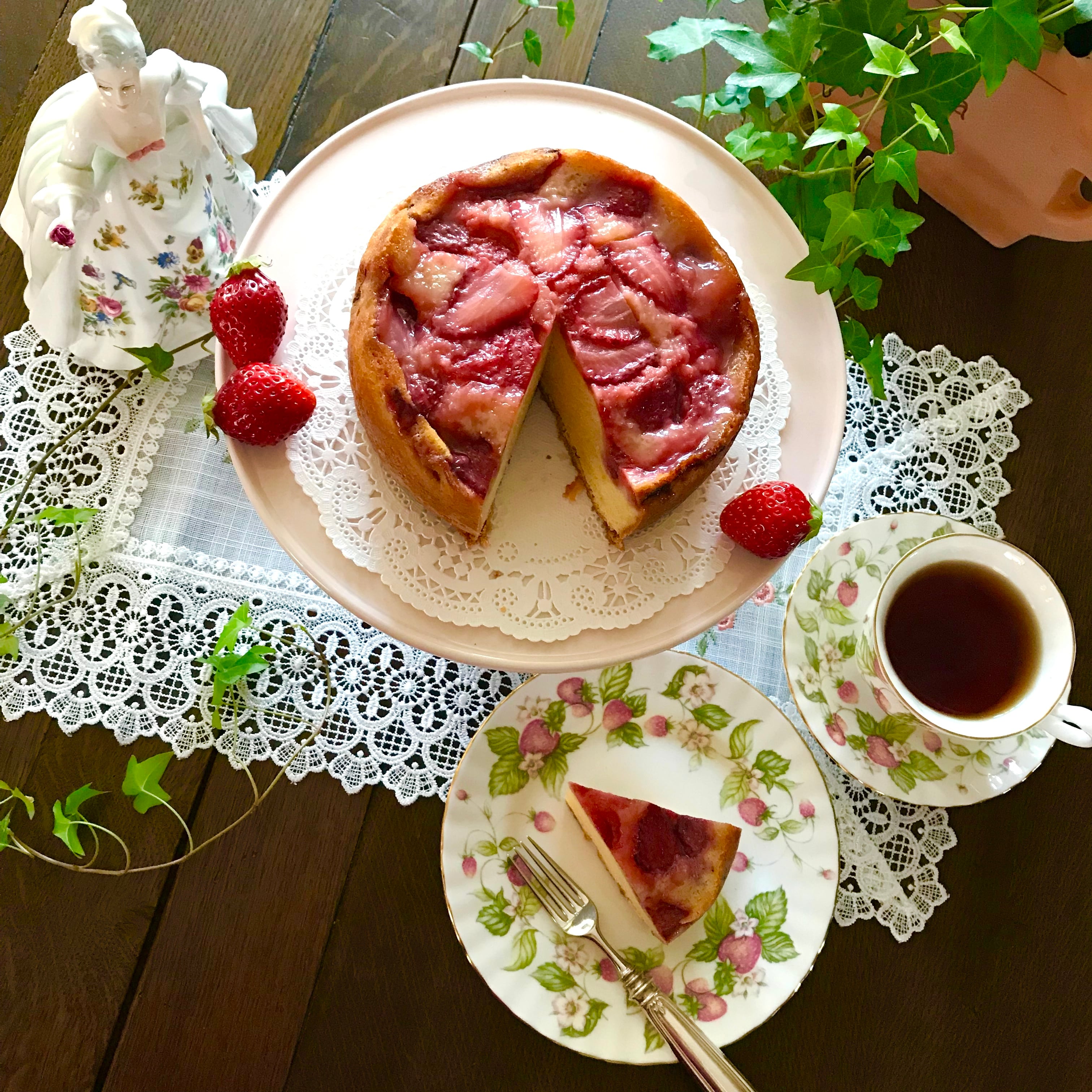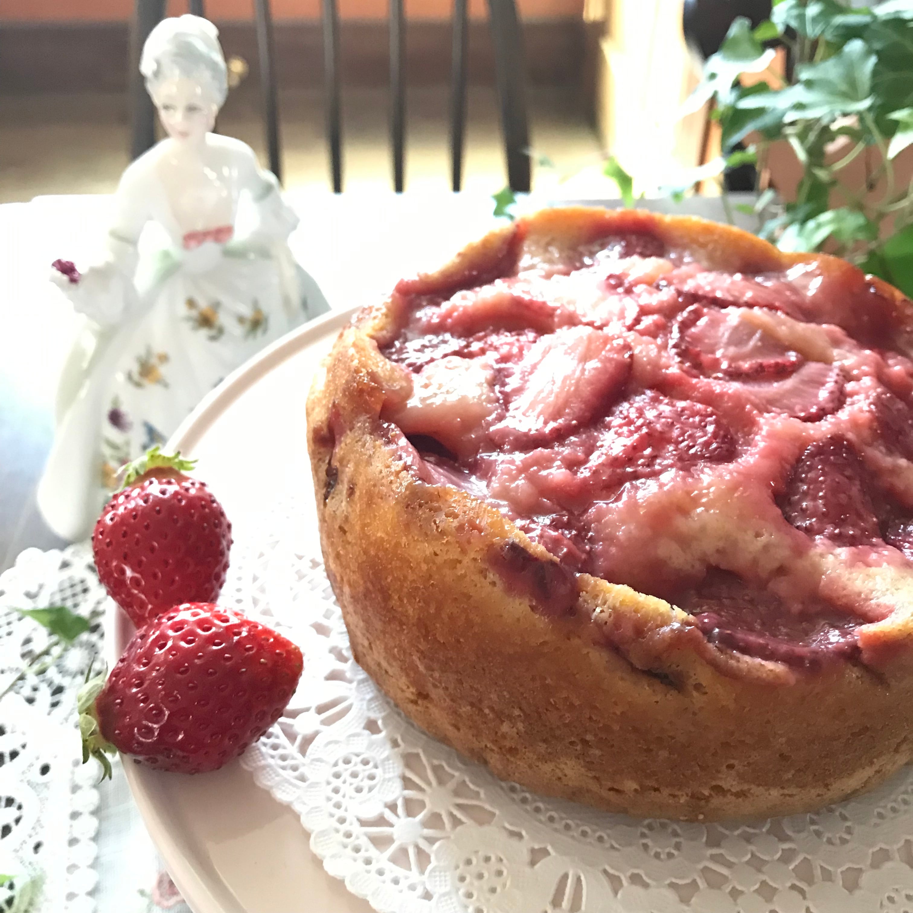 フレッシュな国産イチゴを型に敷き詰め、その上に生地を流して焼き上げ、ひっくり返す、アップサイドダウンケーキです。