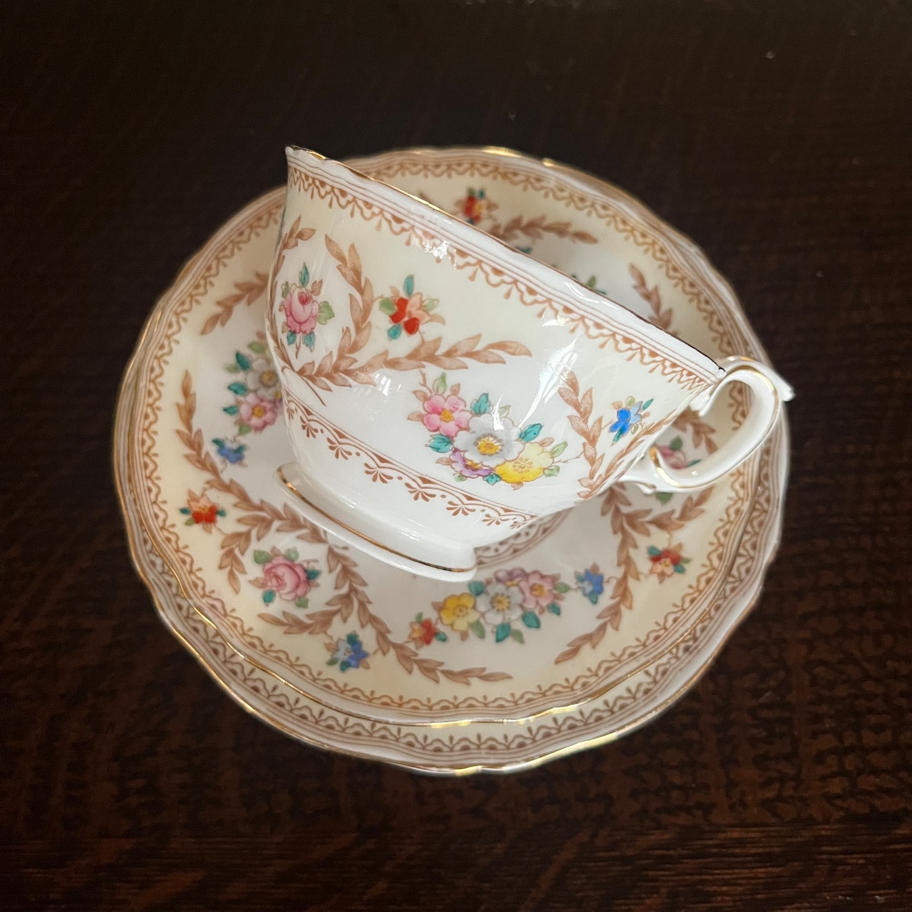 ティータイムを特別なひとときにしてくれる、スタッフォードシャー窯ボーンチャイナのトリオセットです。
