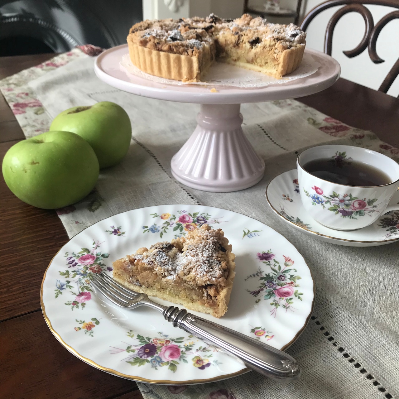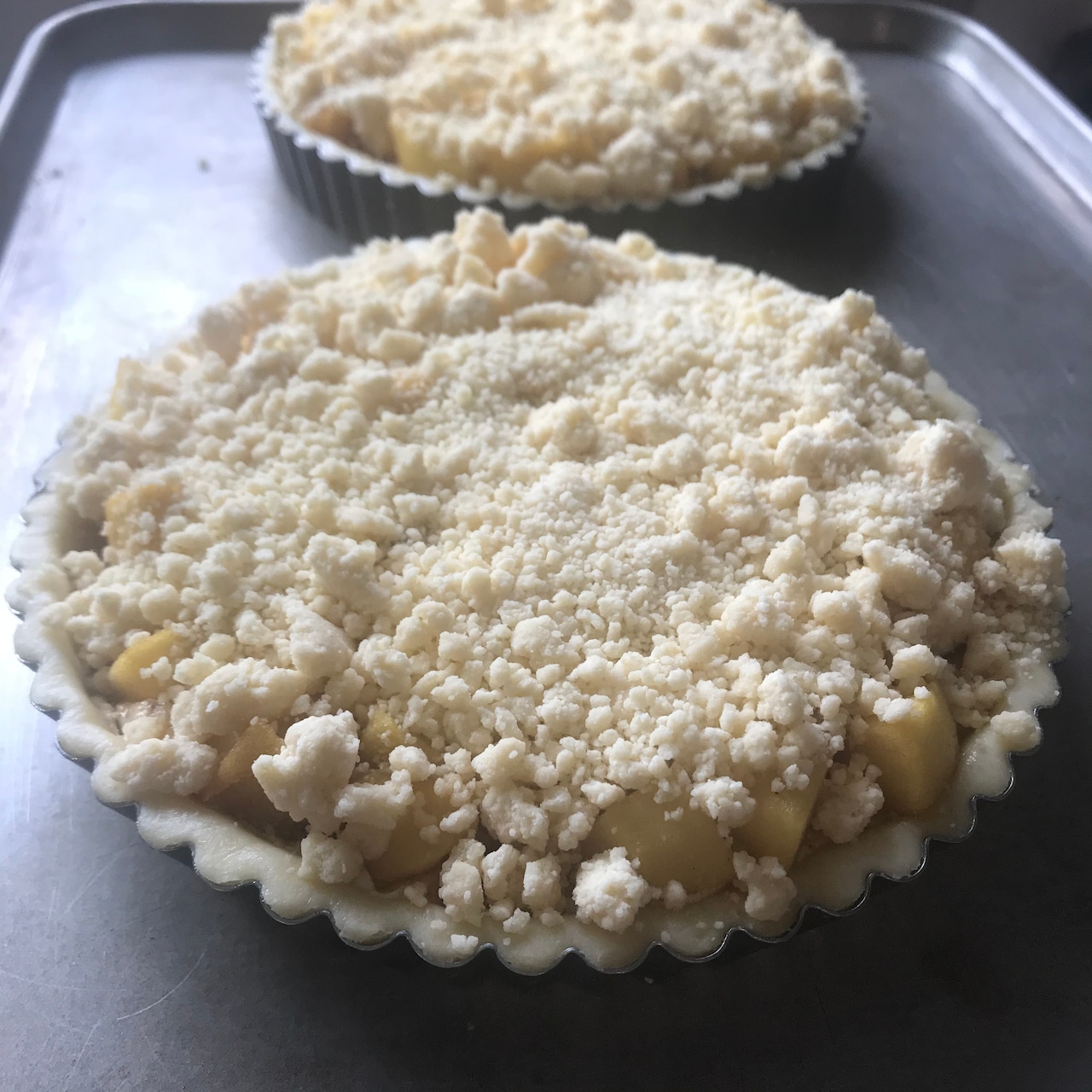 サクサクのクランブルと、キャラメルの香りをまとった酸味のあるリンゴ、コクのあるアーモンドクリーム、タルト生地(イギリスのパイ生地で、甘くないショートクラストペストリー)。