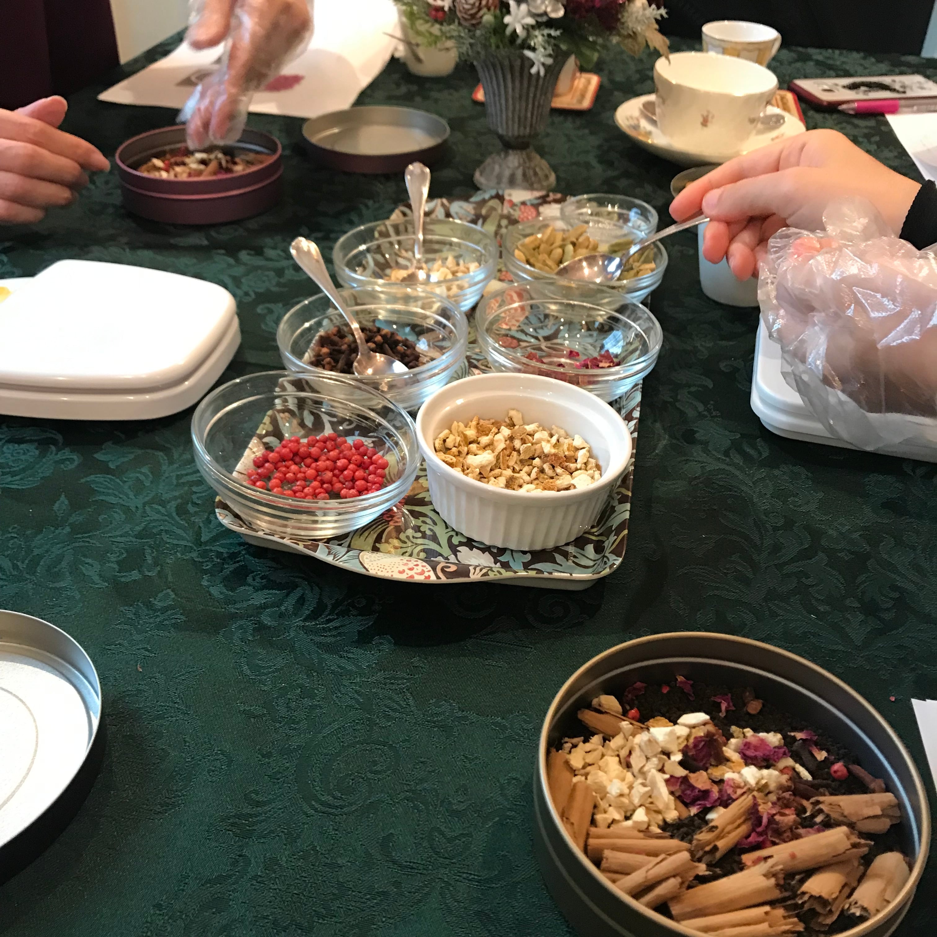 数種類のブランドのクリスマスティーをテイスティングした後は、ご自身で、お好きな配合でクリスマスティーメイキング。